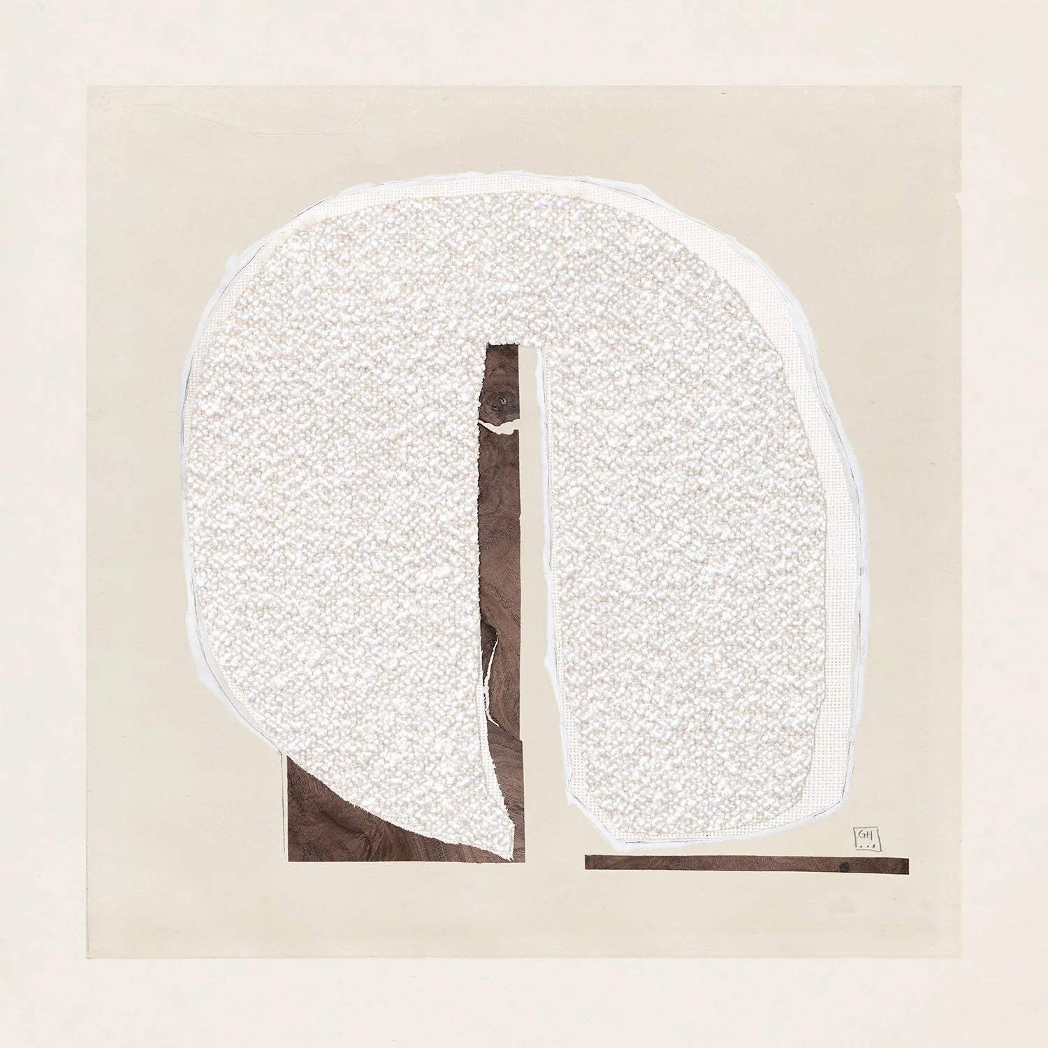 A remarkable collage-style composition using textures of boucle fabric and wood veneer. Small intimate squares inside a wide matte and finished with a brown wood frame. These two materials combine together create a beautiful contrast between the soft , plush texture of the fabric and the natural, earthy texture of the wood, resulting in a visually striking and tactile piece of decor.