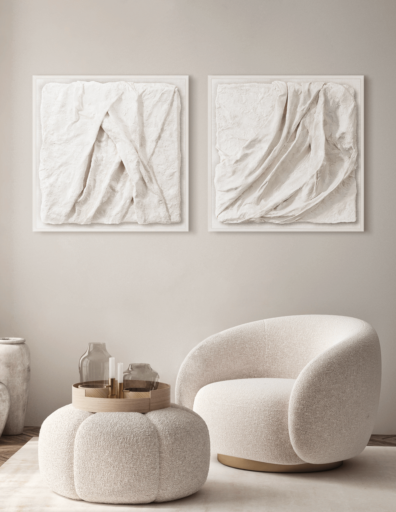 This abstract piece focuses on form and texture. Draped linen, covered in plaster, creates diverse textures and cracks. A monochrome palette highlights sculptural forms, while shadows and intricate details give a striking illusion of three-dimensional depth.