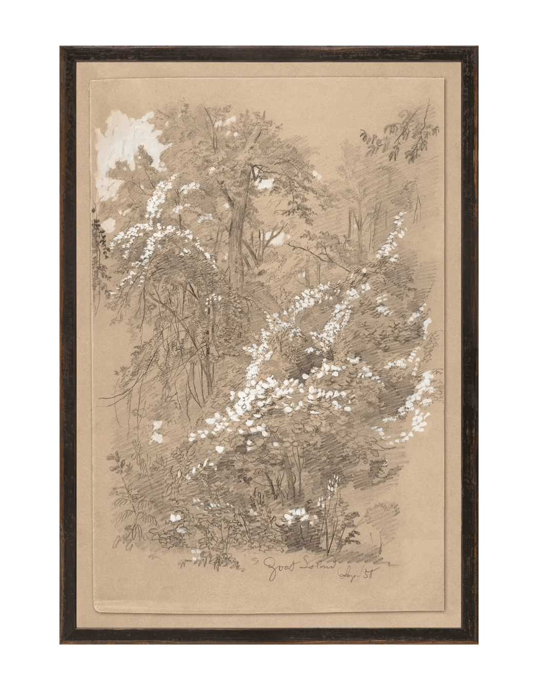 Landscape drawing in charcoal and white over a warm-neutral ground. Finished in a dark wood frame with a distressed finish. Northern Collection is a group of vintage images with a boreal theme. Perfect for cottages, lodges, and any place that benefits from a touch of the outdoors.